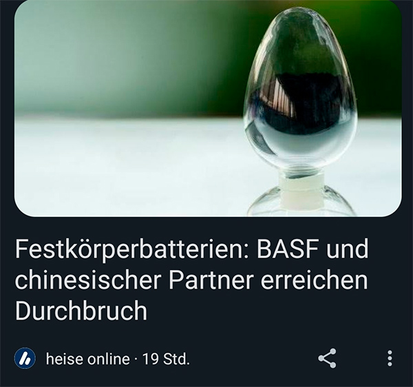 Алексей рассказал о новостях науки и техники: "Твёрдотельные батареи: BASF и китайский партнёр достигли прорыва". И мы прям боимся уточнить, какого именно прорыва они достигли с этой батареей...