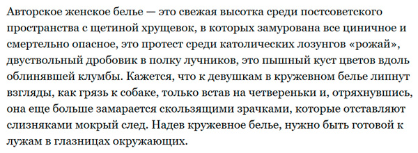 про белье - на "официальном портале Челябинская" - наверное Челябинска, поискал цитату, чтобы найти этот портал для прочтения полной версии статьи, нашел такую же на сайте новосиб-рум.ру, прочел и не пожалел - каждое предложение можно разобрать на цитаты, настолько шикарен полет фантазии копирастеров.