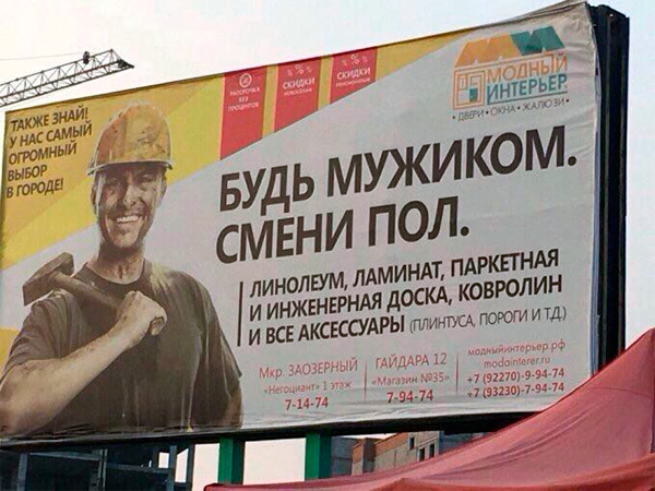 Какой-то очень двусмысленный призыв, считает Миша. Чувак слева - он вообще до смены пола или после?