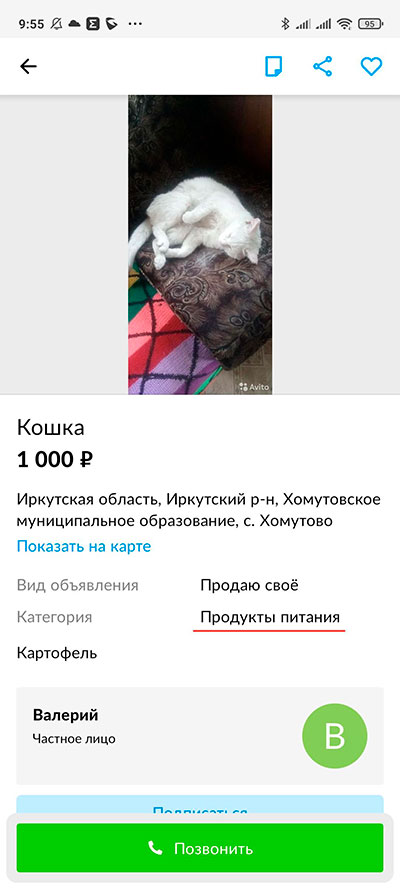 Там же кошка не просто в "продуктах питания", а с уточнением "картошка". Это та самая кошка, с "картошечной" грацией