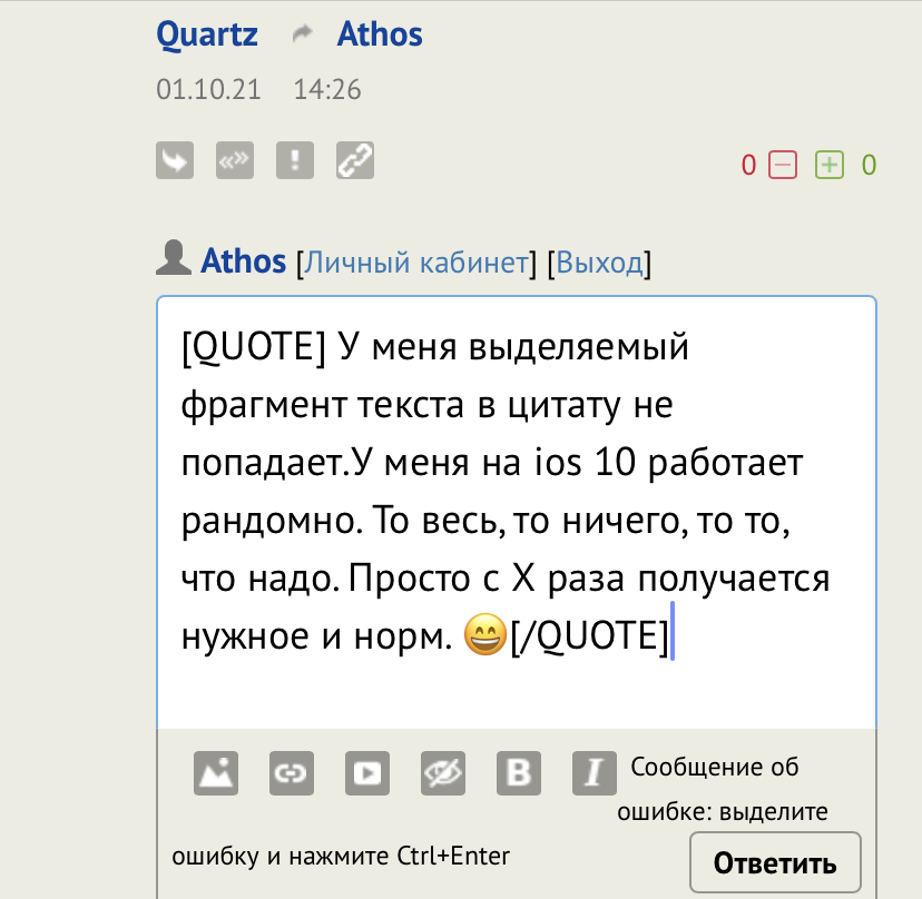 Кстати, а как у вас работает кнопка цитирования на айфоне?