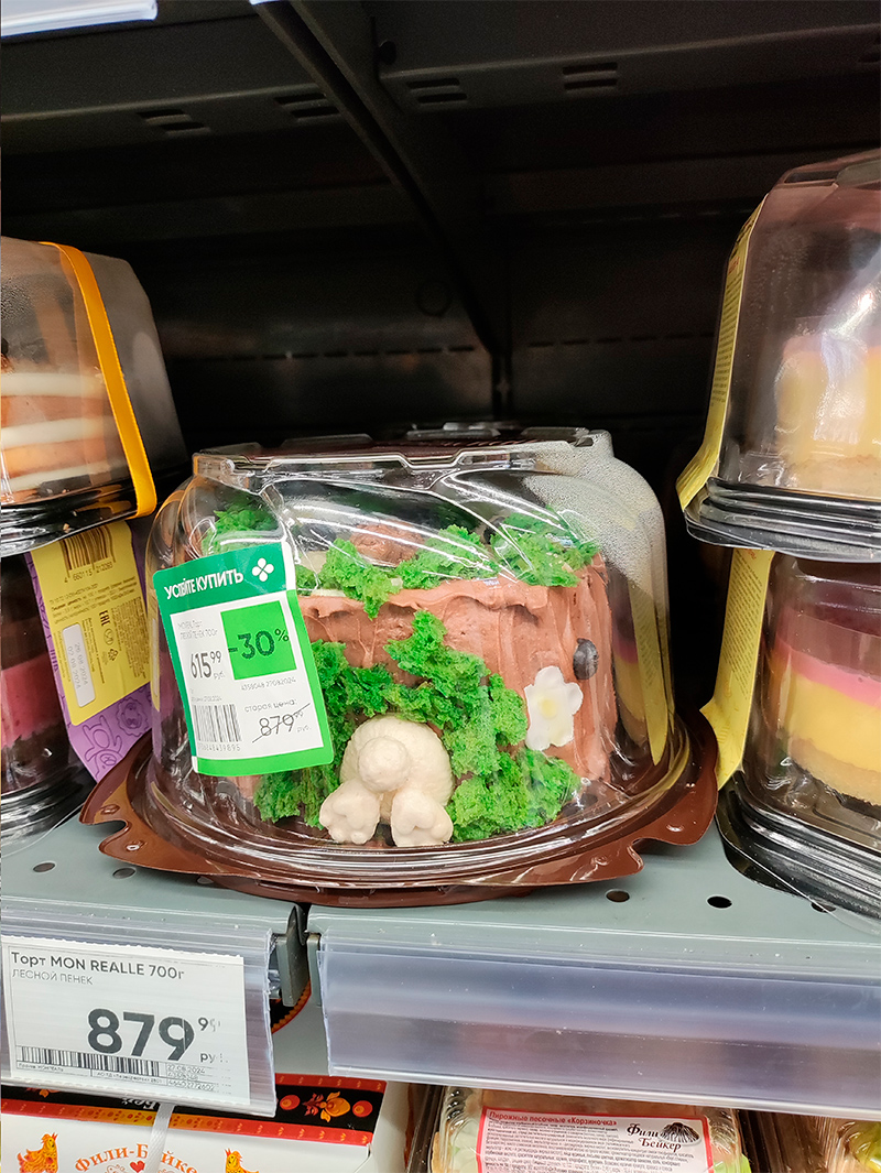 Евгений обнаружил в "Перекрестке" вот такой кулинарный шедевр. По идее он должен называться "жопка какого-то зверька, торчащая из сухого пня", но табличка гласит, что это "Mon realle", что в переводе с французского - "Моя реальность". Ну, видимо, у кондитера - такая реальность. Правда, скидка показывает, что у покупателей реальность все-таки несколько отличается.