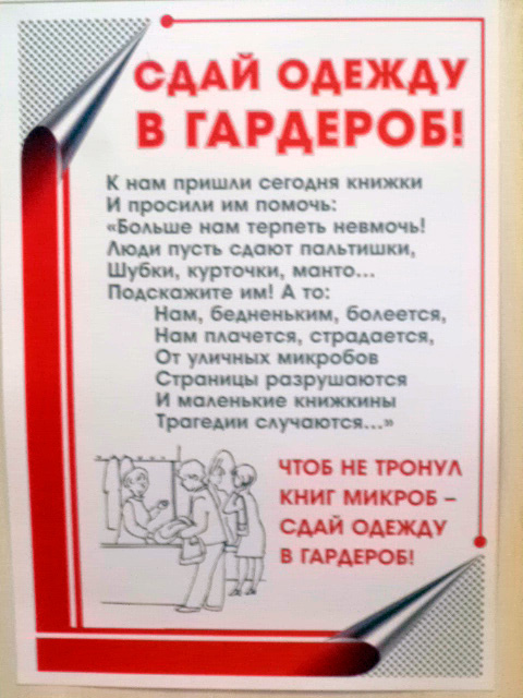 Михаил прислал совершенно чудесный библиотечный креатив. "Штоп не тронул книг микроб - сдай пальтишку в гардероб": это же гениально!