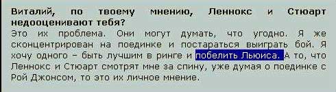 Виталий Комаров выяснил, что именно Кличко хочет сделать с Льюисом. Интересные данные, между прочим. Целая интрига. Мы-то думали, что Кличко хочет ему просто физиономию набить. А там все намного сложнее...