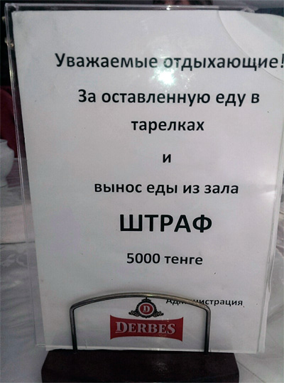 Последняя картинка относится к кафе с типом обслуживания "одна цена - ешь сколько влезет". В таких заведениях нередко бывает штраф за несъеденное; в Сингапуре (да и вообще в юго-восточной Азии), например, распространены подобные кафе с возможностью готовить самому; штраф - в среднем 5 сингапурских долларов за каждые недоеденные 100 гр. При входном ценнике 12.