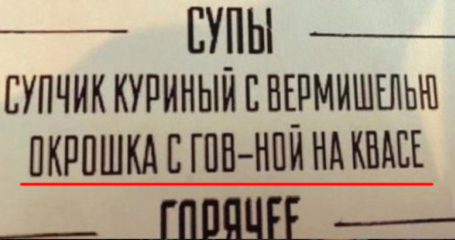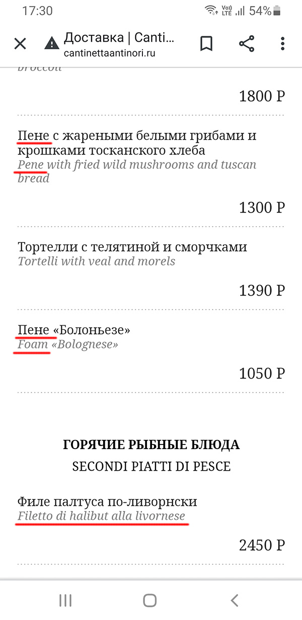Это, ребята, вздыхает Людмила, не у китайцев и не забегаловка в Сочи. Это дорогущий ресторан Cantinetta Antinori в центре Москвы самого, понимаете ли, Аркадия Новикова. Мало того что итальянская паста "пенне" у них вдруг превратилась в "пене", так еще в переводе на английский блюдо сначала превратилось в Pene (такого слова в английском нет вообще), а потом еще и в Foam (вот это "пена" и есть - например, морская). Приятного аппетита, короче говоря, жрите вашу пену за дикие деньги и не отсвечивайте.