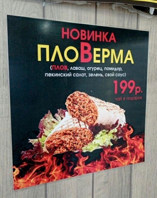 Что делать, когда плов получился настолько кошмарным, что его никто не покупает? Правильно - засунуть его в лаваш, написать "Пловерма" и повысить цену вдвое!