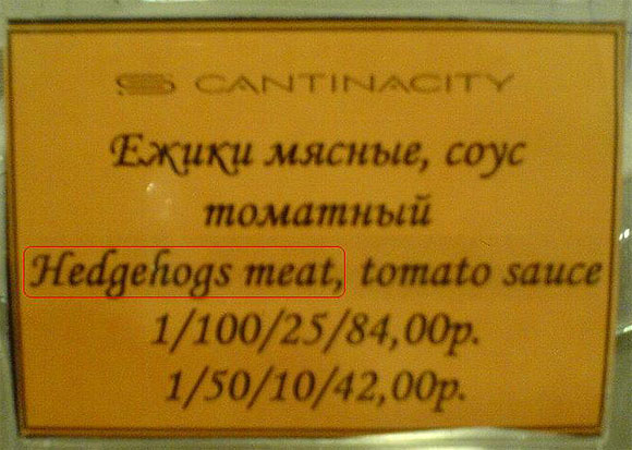 В столовой офисного центра, где немало иностранцев, рассказала Stepanida, любят переводить названия блюд на английский. Но так как перевод делает баба Фрося, результат, как говорится, налицо. Иностранцы в эту столовую почему-то теперь не ходят.