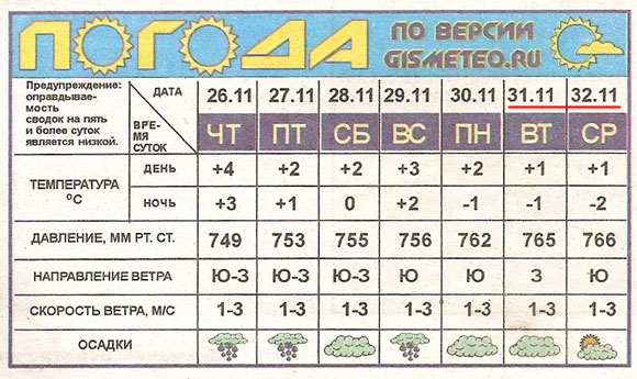 Это еще что, подхватывает Екатерина. Вон у них в газете "Мозаика" 31 и 32 ноября в этом году обнаружили. Видать, взяли повышенные обязательства.