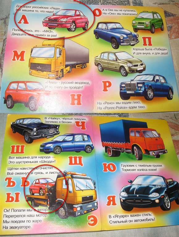 Александр прислал пару страничек из "Детской автомобильной азбуки". Все-таки правильно детишек сразу приучают к тому, что у "Лады" постоянно перегревается мотор и она передвигается только на эвакуаторе. Пусть готовятся к реальной жизни. И копят деньги на иномарку, которые нам любезно пытается запрещать покупать родное правительство.