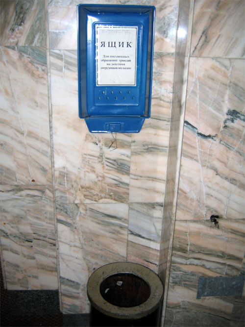 Это просто нанотехнологии, умиляется Владимир. Обратите внимание: низ ящика для письменных жалоб на действия сотрудников милиции открыт, а под ним стоит мусорное ведро. Гениально!