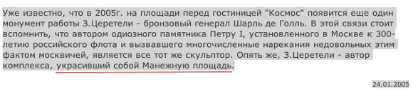 Александр Евтюшкин испуганно сообщил, что Манежную площадь украсили Церетели – собственной персоной...