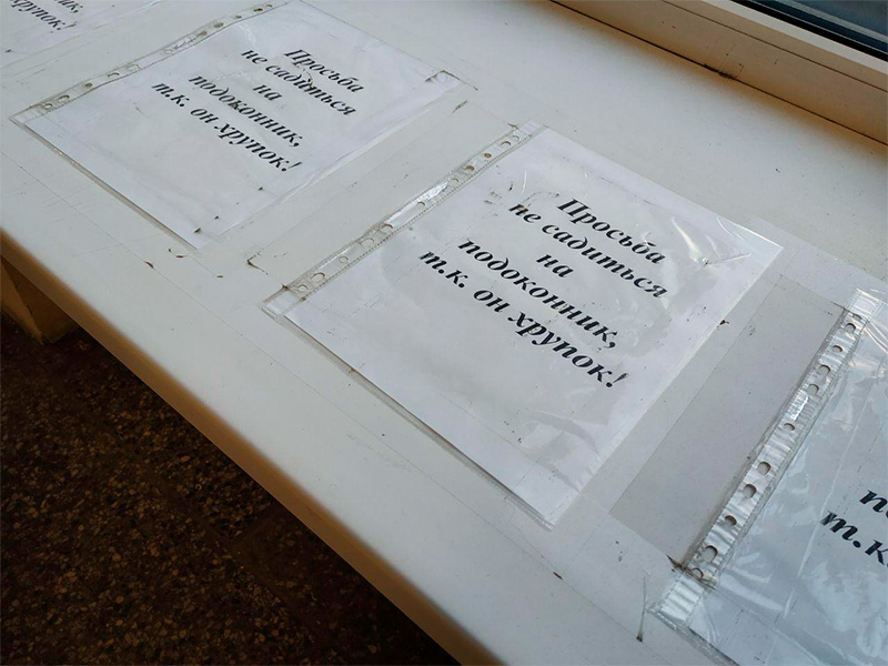 Дмитрий рассказал историю с подоконниками пятого корпуса ЛЭТИ. Вместо нормальных подоконников сделали какое-то барахло, но озаботились прикрепить предупреждение.