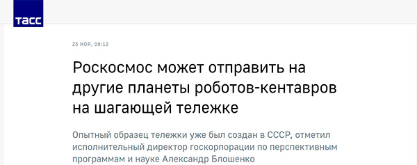 Вадим прислал волнующие новости из Роскосмоса. Скоро, скоро роботы-кентавры шагнут по другим планетам. Правда, пока есть только тележка, потому что роботов-кентавров в СССР почему-то так и не изобрели, но всегда есть возможность отправить саму шагающую тележку.