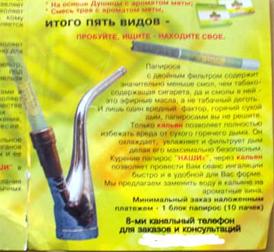 Хорошие люди, рассказа Vinnikova Marina, нашли классный способ, как сделать так, чтобы курение не доставляло проблем, а доставляло только сплошные удовольствия. Знаете как? Берете вместо табака одну травку... Ну, знаете, такую очень полезную в народном хозяйстве травку, которая много где растет, сушите ее, закатываете в папироску и курите. Заметьте, это вовсе не табак, поэтому никакого никотина! А уж в башке-то как плывет, как плывет... Думаете, это шутка? Ничего подобного! Папиросы "Наши". Вот они: