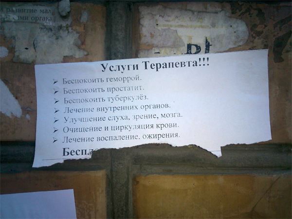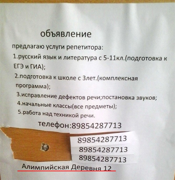 А объявление про репетитора, я думаю, не от репетитора, а от его коордЕнатора. Там же сказано - предлагаю услуги репетитора. А ему совсем необязательно пользоваться услугами своего же работника. Отрывные купончики внутрь листа - это мило. И заголовок от кэпа - "объявление"