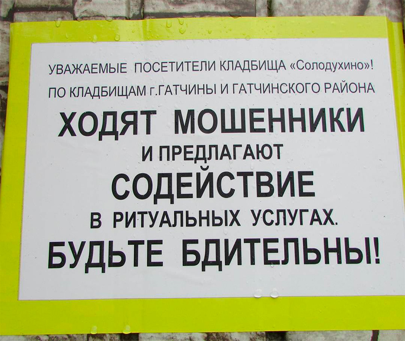 Будьте бдительны, просит Валя. Содействие в ритуальных услугах не сотрудников кладбища "Солодухино" будет считаться недействительным, и соответствующие ритуальные услуги будут аннулированы. Ну или же лишены ритуала.