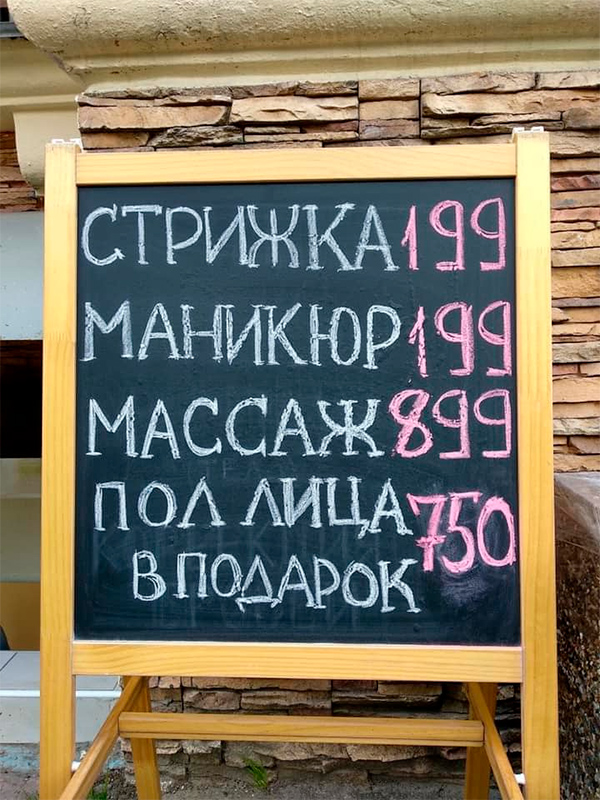Первая повергла в когнитивный ступор (помимо крови из глаз от перевернутой Б в качестве девятки). Это же прейскурант. Приходишь, выкладываешь 750 и получаешь "пол лица в подарок". Штоа???