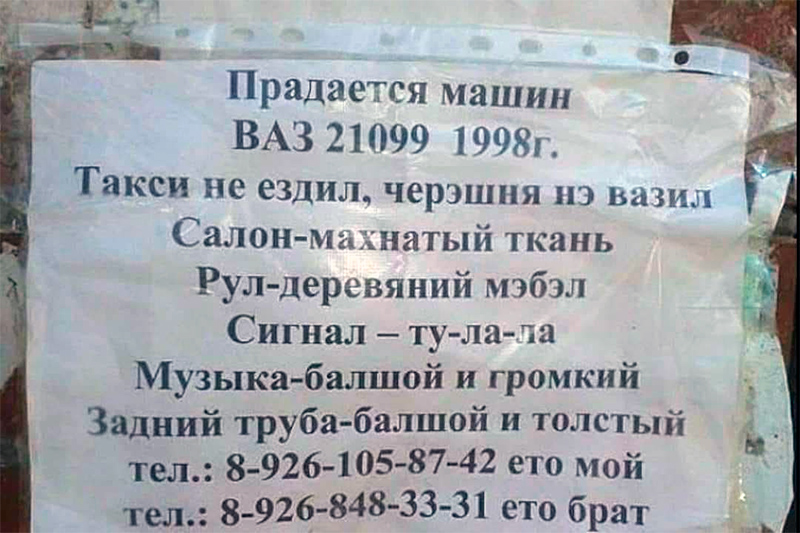 Уверен, что объявление о продаже авто написал человек с хорошим знанием русского языка и неплохим чувством юмора. Ему бы в маркетологи (если уже не там).