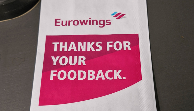 Авиационная компания Eurowings, удивляется Андрей, благодарит за "foodback". Это, в смысле, за то что вернули еду, выданную в самолете?