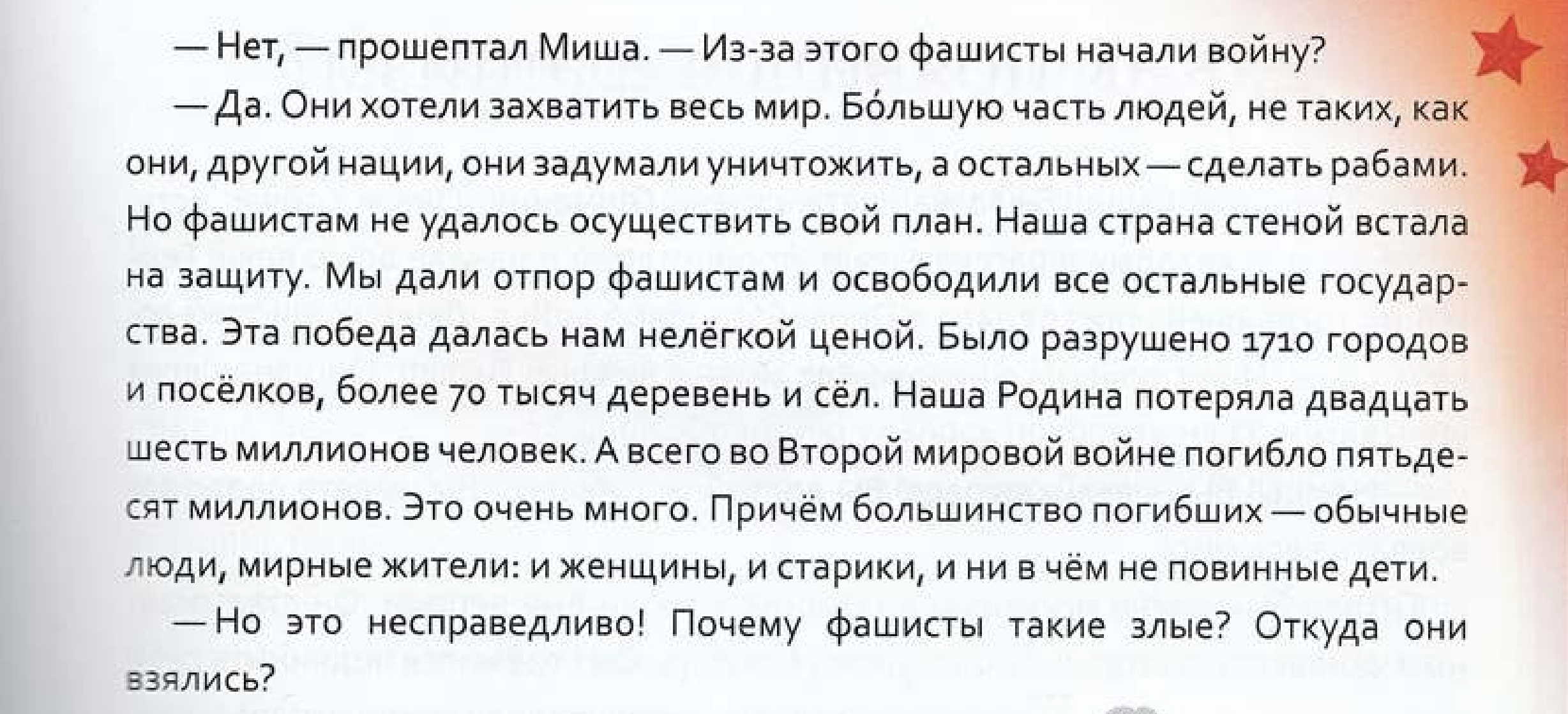 Все штампы и выдумки советской пропаганды присутствуют в книжке в ассортименте - и про "28 панфиловцев, подбивших 18 танков", и про Колобанова с Маринеско, и про "улучшенную" версию рассказа о Зое, "выполнявшей опасные задания".