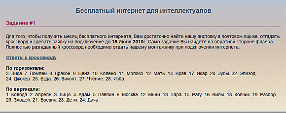 Кирилл увидел мощную маркетинговую замануху у одного из провайдеров. Месяц бесплатного Интернета для интеллектуалов. Суперинтеллект должен заключаться в умении вписать написанные на сайте правильные ответы в формочку кроссворда. Забавно. Для этого требуется уровень интеллекта примерно третьего класса школы.