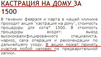 Александр настойчиво рекомендует замечательный сервис - "Кастрация на дому". Для кота услуга стоит $1500. Но если хозяин накопил требуемую сумму, он также может принять участие в акции.