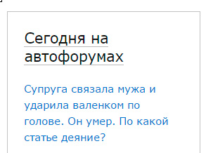 "Супруга связала мужа и ударила валенком" -- это из задачника для студентов-юристов, а на автофорумах -- потому, что парень задал вопрос в правовом разделе дромовского автофорума. Ветка была весёлая, да -- forums.drom.ru