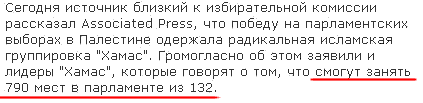Шустрые ребята, этот "Хамас", удивляется Епанчинцев Влад. Только их выбрали, как они сразу решили занять 790 мест из 132. Они, конечно, просто считать не умеют, но подобные безграмотные шустрики и действительно могут занять все что угодно.