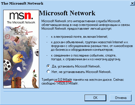 Зато MSN готов устанавливаться куда угодно. Хоть на дискету! А ведь еще говорят, что продукты MS требуют много места для установки...