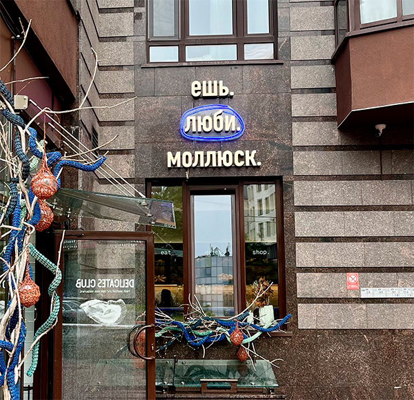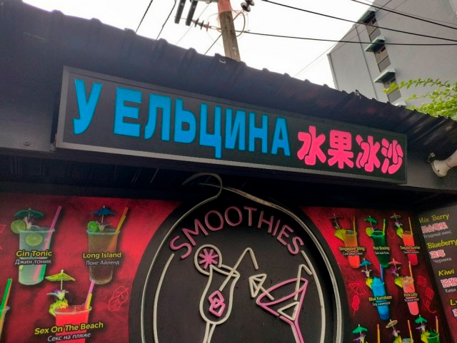 Китайцы однако умеют удивить. Почему "У Ельцина"-то, тем более что там подают какие-то смузи? Если нужно было написать что-нибудь по-русски - ну так написали бы "Водка". Это привлекло бы на порядок больше народу, чем "У Ельцина". Кому он вообще нужен, этот Ельцин?!!