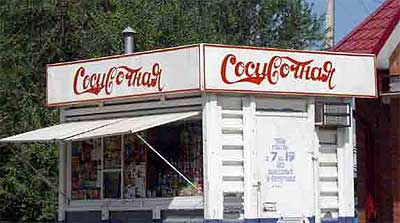 Какая прелесть! Остается гадать, что именно владельцы киоска нам хотели сказать этой незатейливой ассоциацией. Что их сосиски делаются так же, как и кока-кола - ведро патоки на ведро всякой химии и разбавить водичкой из-под крана? Или что эти сосиски также, как и кока-кола, убивают слона в течение пары минут? Не знаю. Это нужно у них спрашивать. Но что безвестный художник вывески решил лишний раз не напрягаться - факт.