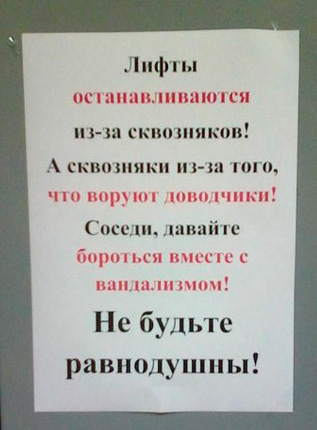Хм, а что с лифтами не так? Они реально могут не работать из-за сквозняков в подъезде (парадной) в высоких домах. Не в курсе всех технических деталей, но при открытой двери парадной тяга возникает нехилая, особенно при холоде на улице.