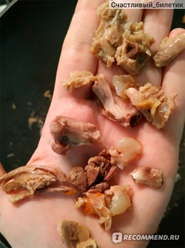 При разогреве и помешивании на сковороде, в мясе так и попадались осколки, тратить своё время и всё перекладывать я не стала. На фото выше и так видно, что мусора достаточно. Я просто выбросила эту тушёнку в мусорку, ибо рисковать и есть такую консистенцию, которую даже собаке давать опасно, я не стала.