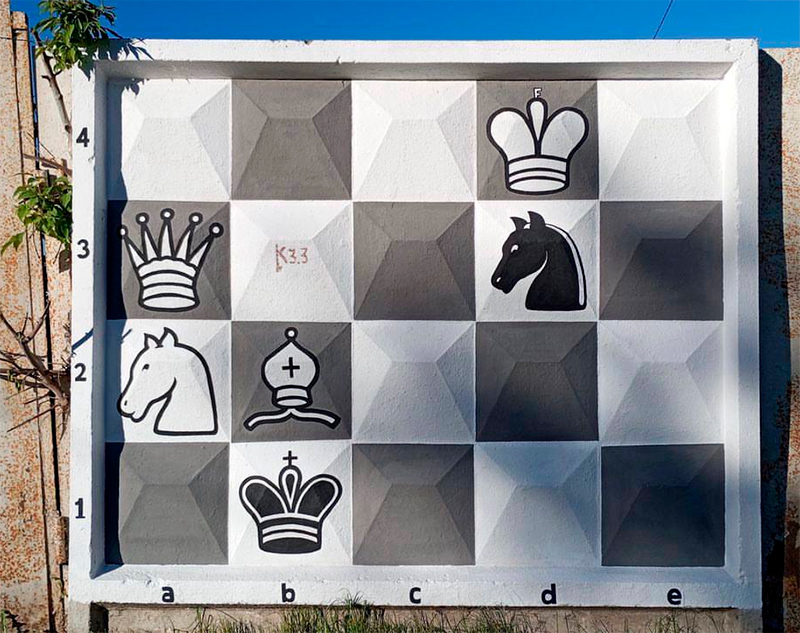 На заборе нарисовали мат. В два хода (ход белых). Автор - художник с псевдонимом Zoom, рассказал Ильфат.
