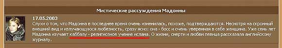 Надеемся, что лет через пять, после того как Мадонна полностью нечувствительно превзойдет исламскую каббалу, она наконец выяснит, что каббала - учение не исламское, а иудаистское. Но потратит ли она еще пять лет жизни на изучение каббалы в свете новых для нее представлений - не очень понятно...