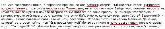 А что, все нормально на самом деле. Просто нападающий Тумилович, огорченный нелепым голом, попросился отдохнуть, и его поставили в ворота - все равно вратарь на поле в основном ни черта не делает. А с Деменко там просто фамилия не с заглавной буквы написана. Не "неистового пенал", а "пенал Неистового". Игрок Неистовый дал Деменко свой пенал - фиг знает, зачем. Деменко в процессе игры кто-то пнул по миндалинам, он разозлился и начал кидаться пеналом Неистового в сторону ворот "Торпедо". Правда, за это ему потом Неистовый навалял люлей в раздевалке, но об этом комментатор умалчивает...
