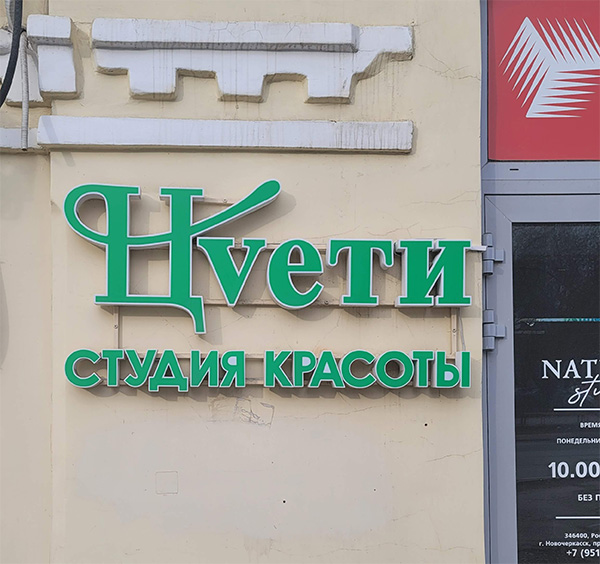 А вот чего тут студия красоты - поди пойми. "Ц" смешанная с "Н", латинская V. То ли это цветы, то ли это повелительное наклонения "Цвети!" - в общем, не понять. Понятно только, что дизайнер, который это придумал, идиот.