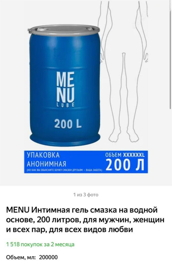 Смазка прям широчайшего спектра применения, поражается Andrew. Да и количества - для очень крепкой любви! Крепчайшей!