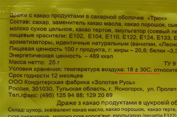 Драже с какао можно хранить при температуре от -12 до 48 градусов Цельсия, изумляется Александр. Ничего себе продуктик! Устойчивый!