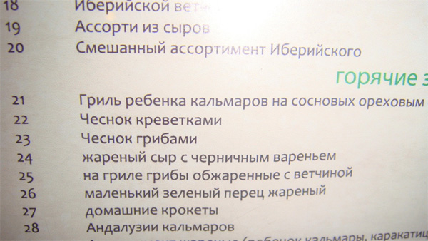 SoZ больше никогда-никогда не будет питаться на Тенерифе! Они там подают гриль ребенка кальмаров на сосновых ореховым - ну не звери ли? И даже чеснок креветками не поможет забыться. Зато жареный сыр с черничным вареньем - вставляет необычайно! Ассортимент Иберийского при этом аж икает!