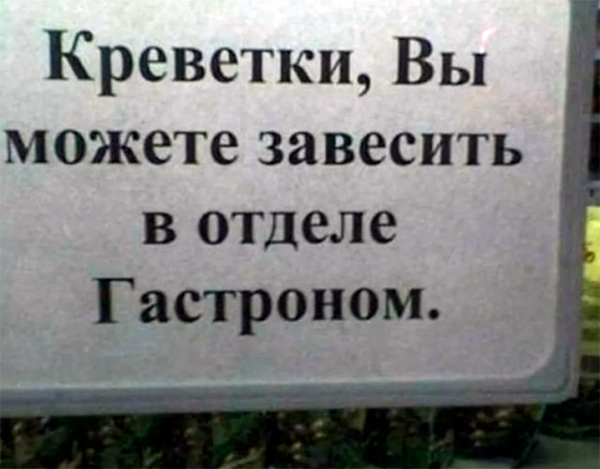 В принципе, считает Антон, с их стороны очень любезно предлагать креветкам что-то там завесить в отделе Гастроном. Вот только что они будут завешивать? Дыры в стене отдела Гастроном, что ли?
