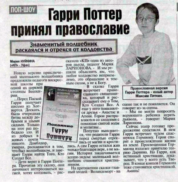 ///Сейчас театр готовит продолжение спектакля. В нем Гарри встречает чудом спасшуюся Гермиону. Герои спорят о происхождении жизни на земле. Просвещенная Гермиона излагает приятелю теорию Дарвина. Но Гарри, как истинный христианин, доказывает, что у всего есть Творец. В конце концов Гермиона тоже становится христианкой.///