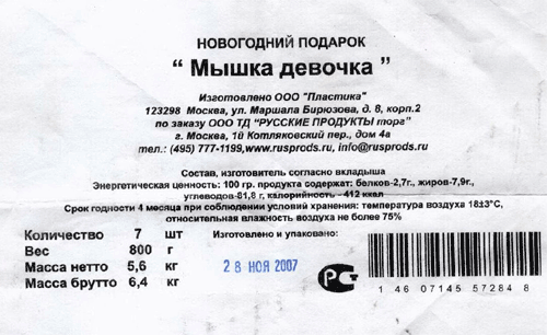 Rovshen предлагает в качестве новогоднего подарка мышку-девочку. Или мыша-мальчика. Подарок съедобный. Хотя и сделан в ООО "Пластика". Видать, хороший такой пластик попался - калорийный.
