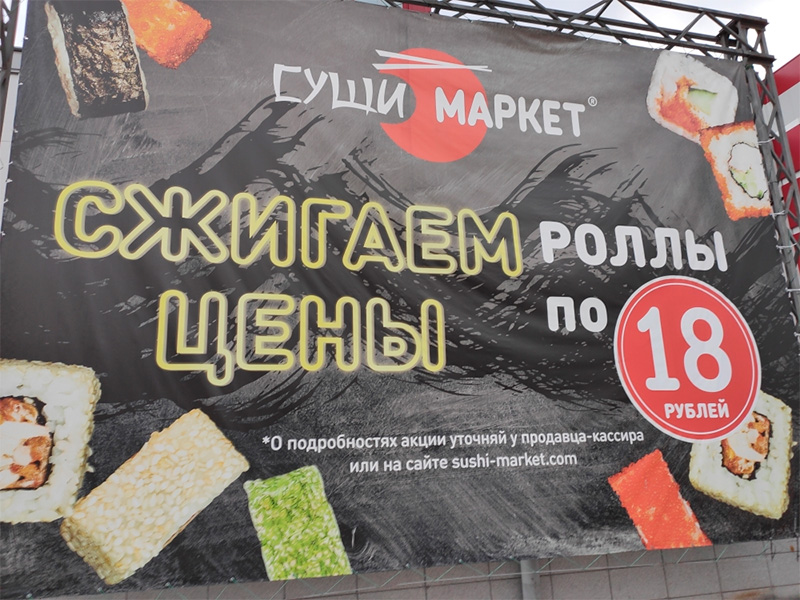 Ну и вот еще рекламка интересная, замечает Александр. Приходишь, платишь 18 рублей и наблюдаешь за торжественным сожжением роллов. Классно придумали, классно!