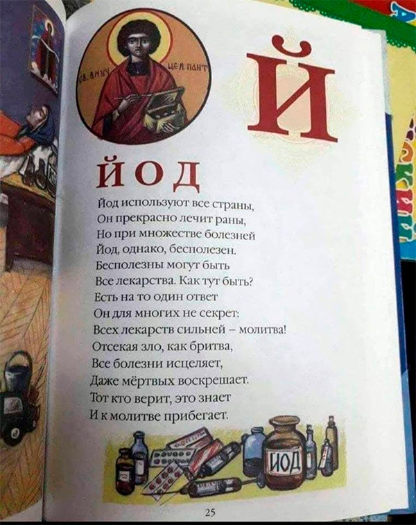 Йод - ничто, молитва - все. И даже больше. Тут недавно в электричке ехал, вдруг услышал какой-то непонятный звук, долго не мог понять, откуда источник. Оказалось - шепот. И не просто шепот - это одна пассажирка книжку читала. Вслух. Себе. Мне даже любопытно стало, о чем может быть настолько увлекательная книга, и я подглядел. Там рассказывалось, что предки наши, как им завещали старцы, и готовили с молитвой, и кушали, стало быть, тоже с молитвой, а потому жили хорошо. А сейчас... Колбасу, поди, любите? Так знайте, ее на мясокомбинатах делают с матюками, а потому от нее заболеть можно. Как же быть? А надо "Отче наш" три раза над палкой прочитать.
