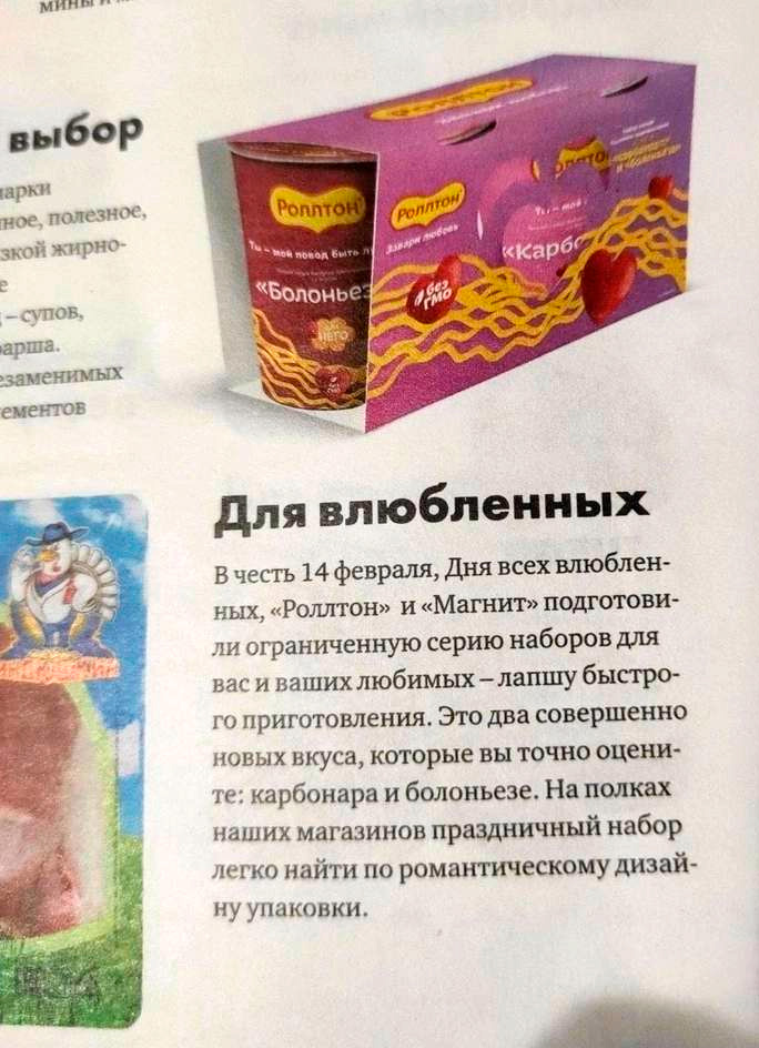 Приятно, конечно, считает Гена Крокодил, что "Ролтон" и "Магнит" так заботятся о влюбленных, что выпустили специальную версию лапши быстрого приготовления, которую можно ласково развесить на ушах. Романтическая лапша быстрого приготовления - что может быть прекраснее?