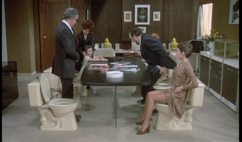 Я смотрел Скромное обаяние. Абсурдистский фильм, где группа господ никак не могла нормально пообедать. Но эпизода с унитазами не припомню. Это удаленная сцена?