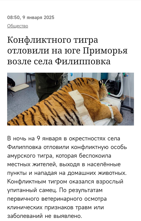 — Тигра назвали конфликтным — но вообще-то тигры далеко обходят места, где живут люди, и если тигр повадился в село, да еще и нападает на местных собак или еще каких животных, это для местных жителей совсем не смешно, а напротив, большая проблема, можно сказать, и конфликт.