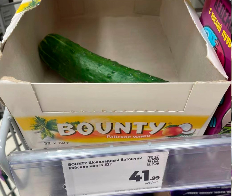 — Надо же, какой-то покупатель положил огурец в пустую коробку от баунти в супермаркете — тема для баннизма!